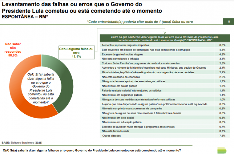 O levantamento também questionou os participantes a respeito das falhas ou erros que o governo do presidente cometeu ou está cometendo até o momento. Embora a maioria também não saiba dizer o que desagrada, a percepção negativa sobre os deslizes da gestão atual é maior do que o reconhecimento pelas realizações. Dos entrevistados, 58,9% não sabem ou não responderam, mas 41,1% citaram alguma falha ou erro. Dos temas mais apontados, 6,6% dos brasileiros consideram o aumento ou reajuste de impostos como o maior erro. Já para 4,8% a falha é estar envolvido ou não combater a corrupção. Outros 4,8% recriminam ainda o “excesso de gastos ou muitas viagens” presidenciais. O presidente viaja nesta terça-feira ao Egito e à Etiópia para a primeira viagem internacional de 2024. Outras falhas citadas pelos entrevistados incluem falta de controle da inflação (3,1%), aumento do número de ministérios (2,4%), falta de reajuste salarial (1,1%) e não investir em segurança pública (1,1%), entre outros.