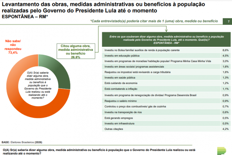 A maioria dos brasileiros não consegue enxergar as obras e realizações do governo federal. É o que mostra levantamento do Instituto Paraná Pesquisas divulgado nesta terça-feira, 13. Segundo a pesquisa, 73,4% dos entrevistados não sabem ou não responderam ao serem questionados sobre “alguma obra, medida administrativa ou benefício à população” feito pela gestão do presidente do PT.